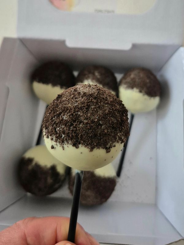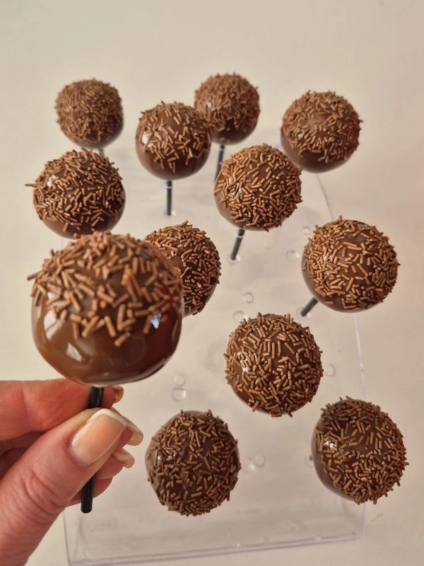 Flavoured sponge, mixed with chocolate ganache, covered with chocolate and secured on a stick.